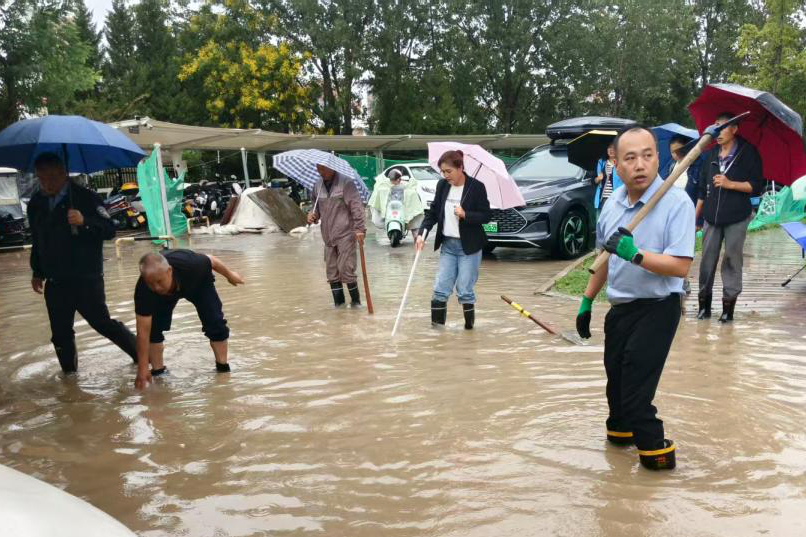 9月16日早晨,一場(chǎng)特大暴雨突然降臨,短時(shí)間內(nèi)降雨量急劇攀升,繡園管理中心迅速響應(yīng),緊急組織工作人員奔赴積水路段,全力開展搶險(xiǎn)工作,保障園區(qū)安全與秩序。