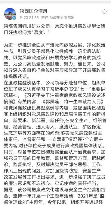 在廉政提醒談話中,公司領(lǐng)導(dǎo)分赴各單位組織單位班子成員認(rèn)真學(xué)習(xí)了習(xí)近平總書記“七一”重要講話精神,《習(xí)近平關(guān)于注重家庭家教家風(fēng)建設(shè)論述摘編》有關(guān)內(nèi)容,《郭鳳蓮:將一生奉獻(xiàn)給人民》和黨風(fēng)廉政建設(shè)典型案例等內(nèi)容,并緊密圍繞貫徹落實(shí)上級組織對黨風(fēng)廉政建設(shè)和反腐倡廉工作的新指向、新要求、新部署、新任務(wù);在安全生產(chǎn)、組織管理、經(jīng)營管理、選人用人、廉潔從業(yè)、礦區(qū)穩(wěn)定、生態(tài)環(huán)境等方面存在的問題;落實(shí)黨風(fēng)廉政建設(shè)主體責(zé)任、監(jiān)督責(zé)任和“一崗雙責(zé)”情況等7個(gè)方面主要內(nèi)容,對各單位班子成員進(jìn)行廉政提醒集體談話。同時(shí),對各單位在貫徹落實(shí)全面從嚴(yán)治黨要求,加強(qiáng)黨員、干部的日常教育、監(jiān)督和管理方面,把脈問診,監(jiān)督執(zhí)紀(jì),及時(shí)解決黨員干部在思想、工作、作風(fēng)上出現(xiàn)的問題,對加強(qiáng)疫情防控、安全生產(chǎn)、改革發(fā)展等工作提出要求,進(jìn)一步增強(qiáng)了班子成員的廉潔意識和不忘初心、牢記使命的責(zé)任擔(dān)當(dāng)。